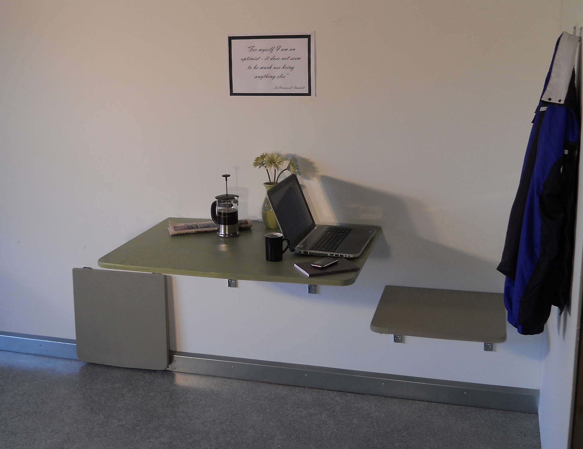 Durable formica laminated wall mounted folding table, great for study desks or a work area.